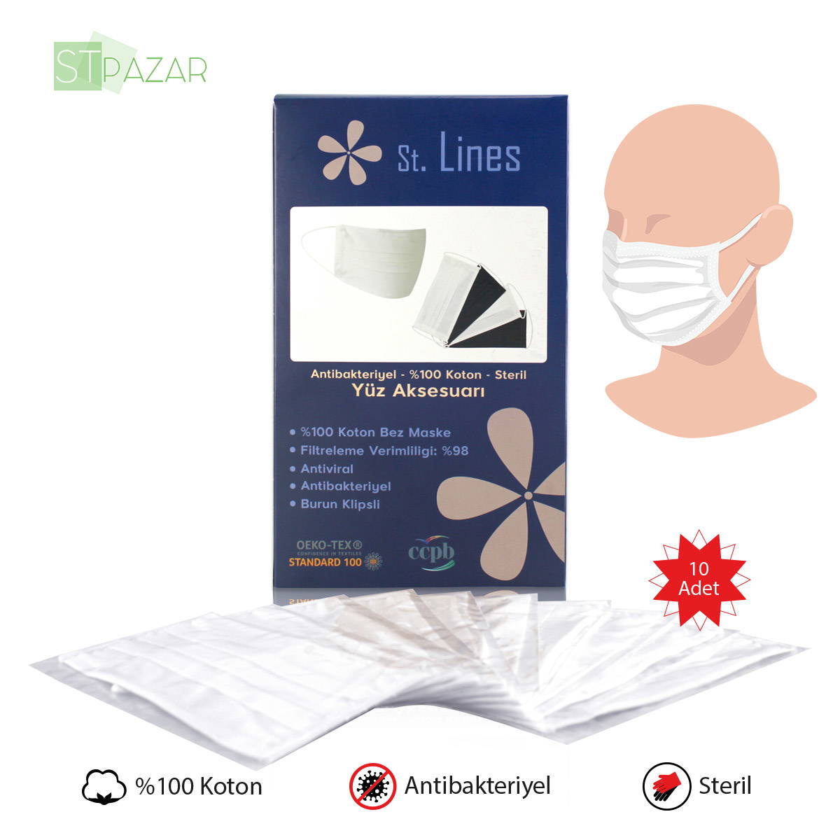 St Lines Antibakteriyel Kumaş Yıkanabilir Maske ( 10'lu Paket )